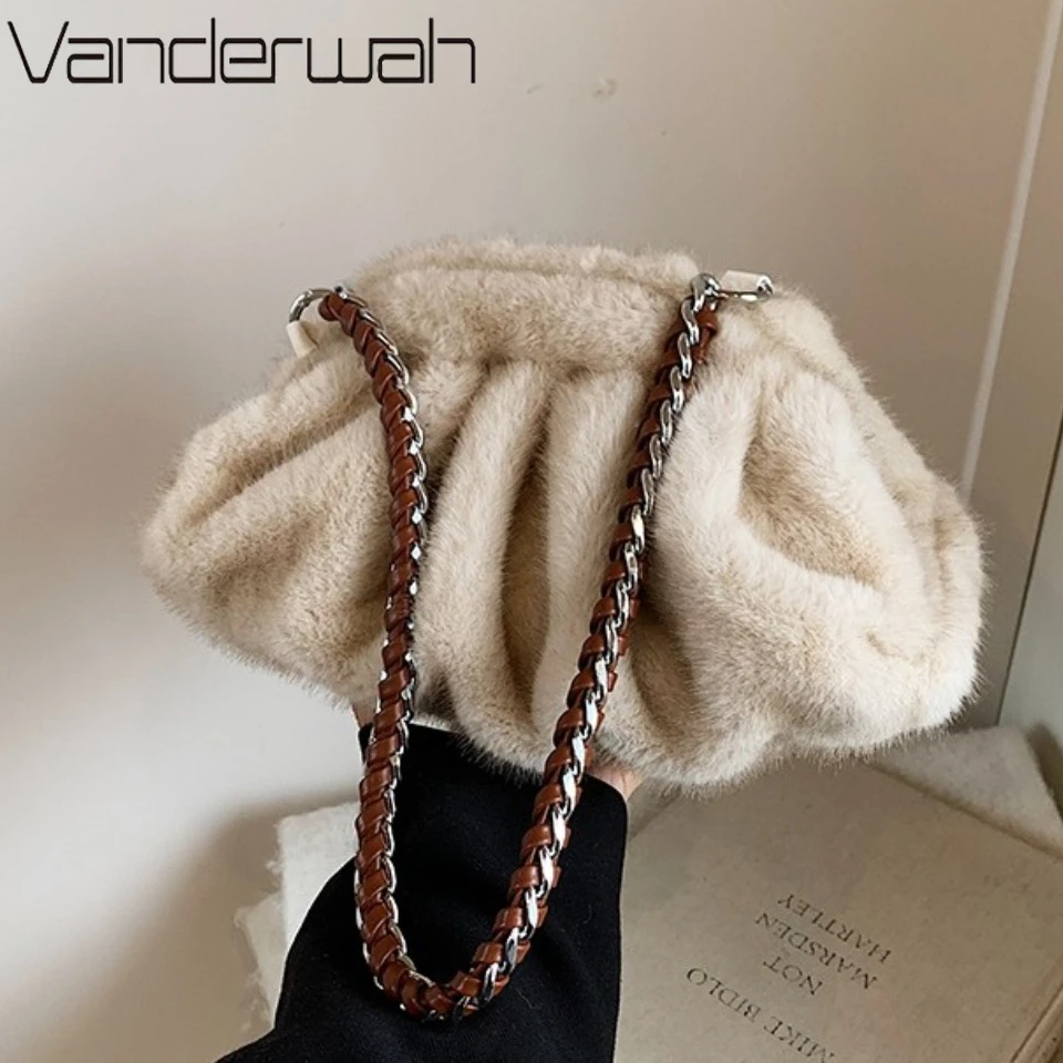 Luxury Women’s Furry Pleated Purses and Handbags Plush Cloud Bag Designer Fashion Chain Shoulder Bags for Women Winter Tote Sac