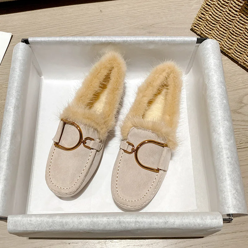 Luxury Brand Shoes, Fur Mocasines Shoes, Woman Winter Cotton Shoes, Ladies Warm Shoes, Flats Shoes, Furry Leather Shoes
