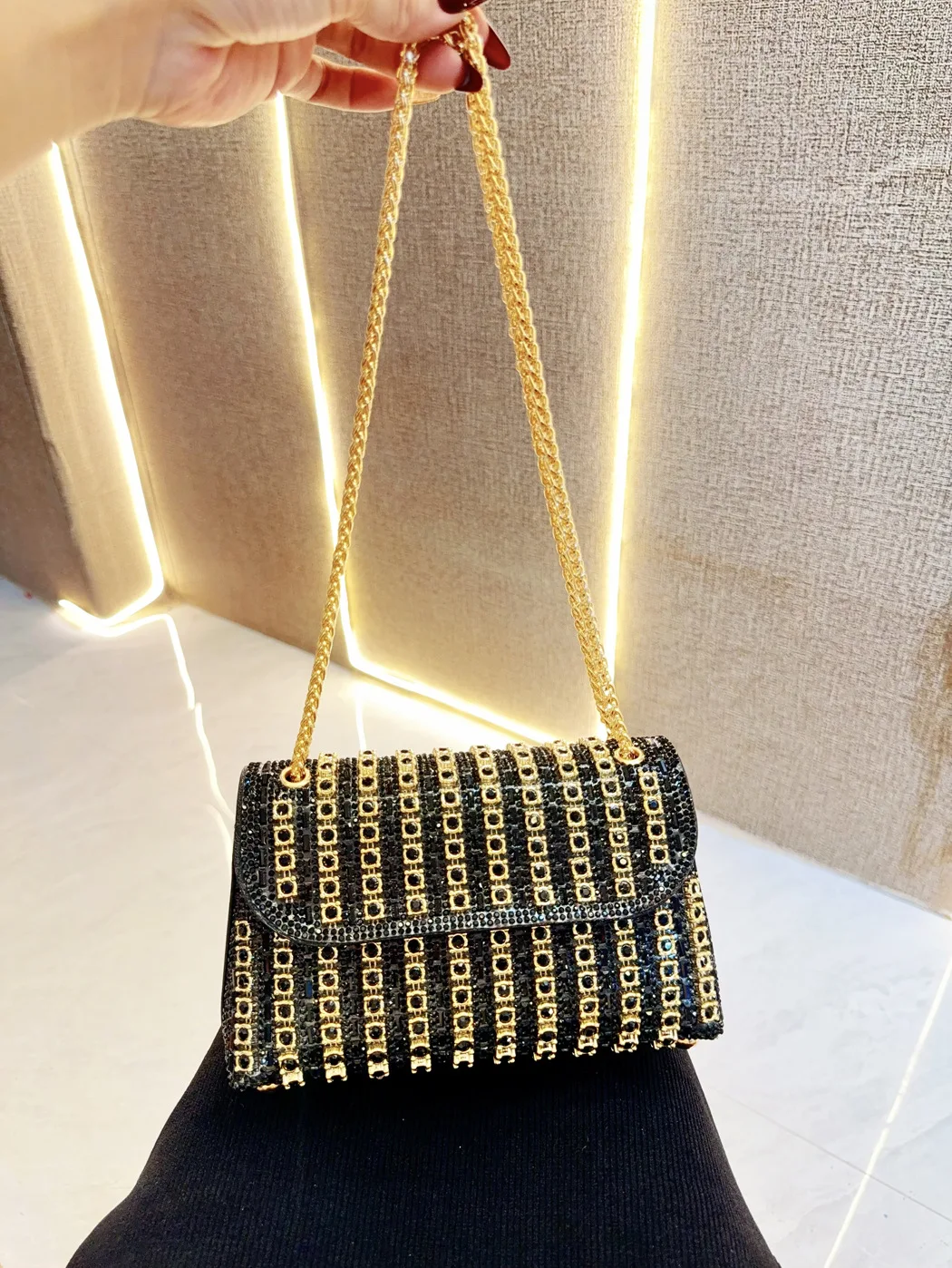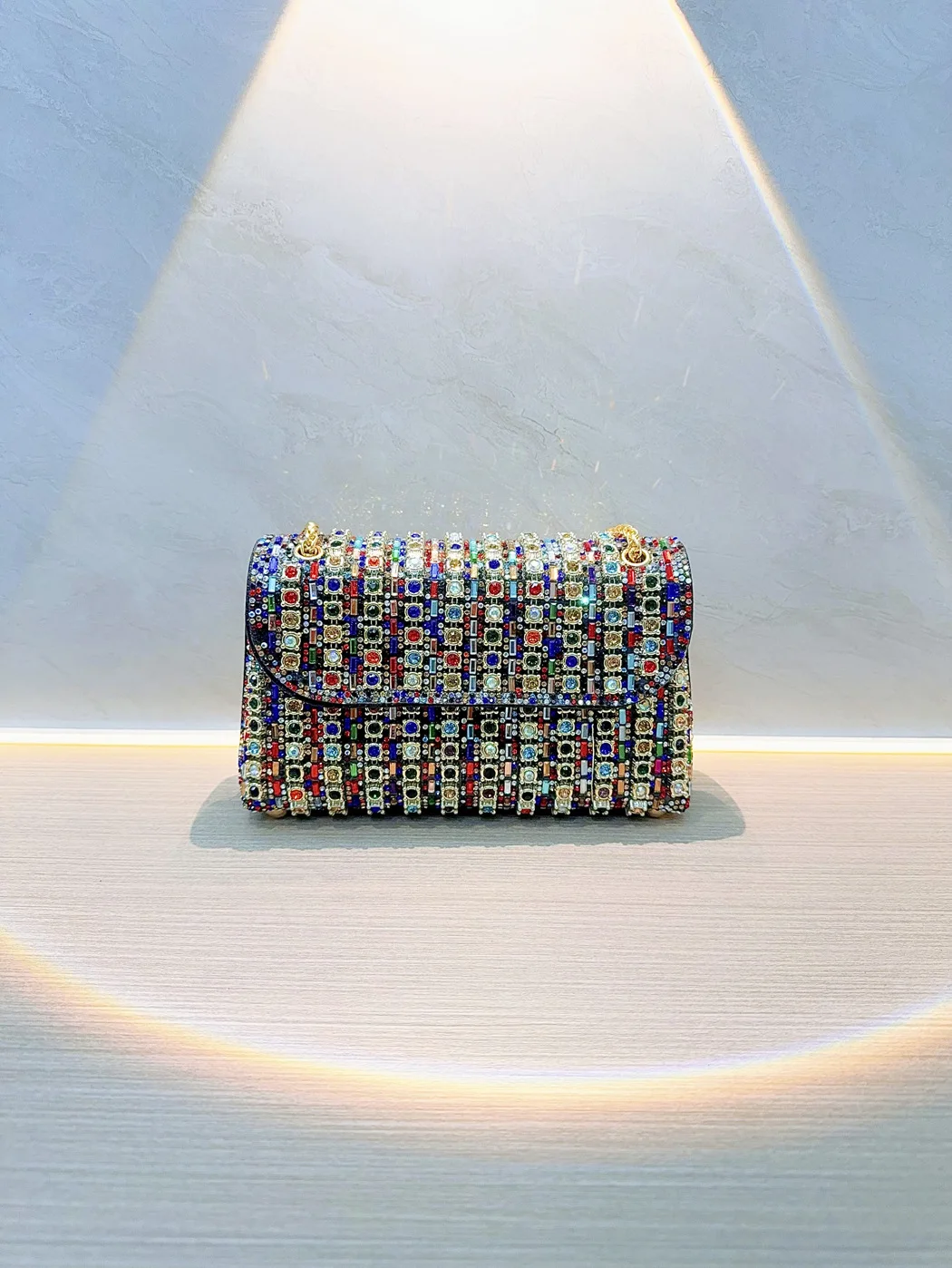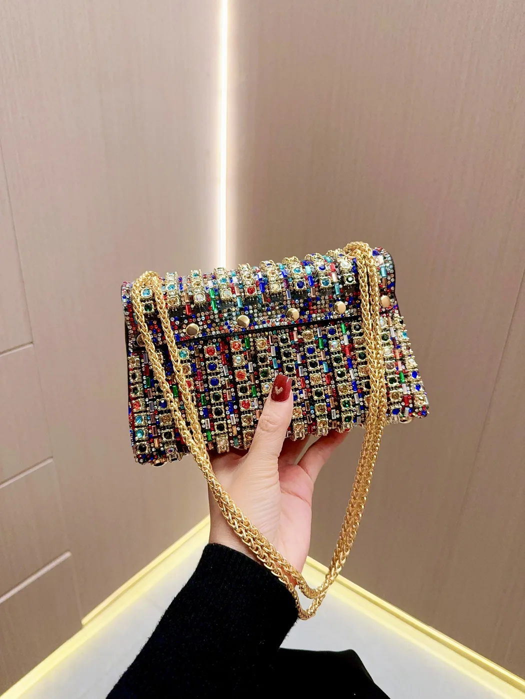 Featuring full rhinestone embellishments, this handbag adds a touch of elegance and sophistication to any outfit.